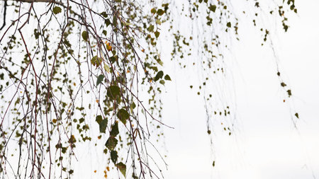 Birch branches with sparse green and yellow leaves hanging down on a white background, creating a delicate and natural scene