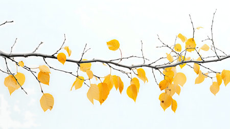 A serene image of a tree branch with golden autumn leaves against a cloudy sky.