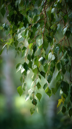 The Silver birch in spring, fresh green leaves, soft sunlight filtering, vibrant atmosphere full of vitality, natural textures, serene mood.