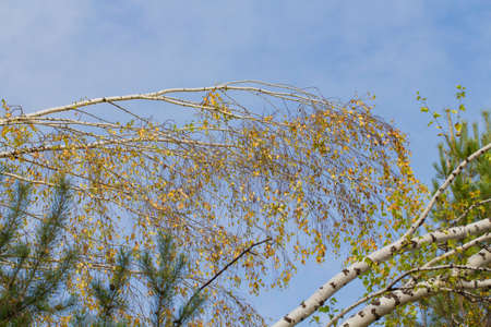 Birch branches with yellow leaves on a background of the sky