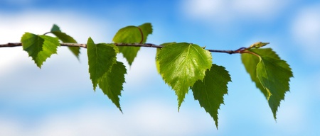 Natural background. Bright spring background with birch branch in the clear blue sky. Branch of a birch tree with fresh new leaves in the spring.