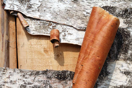 Beresta. The top layer of bark, torn from a birch. Symbol of Russia. Birch bark texture. Russian nature.
