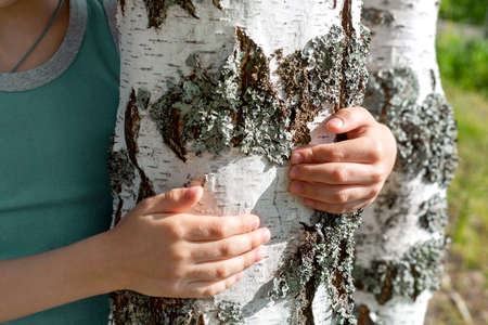 The boys hands hugging the trunk of a birch with mossy birch bark on a sunny summer day. The concept of love for nature and care for the environment