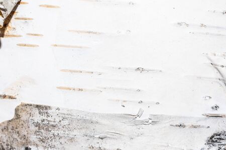 White nature background of birch bark close-up. Plane of birch trunk surface. Tree textured backdrop. Detailed natural texture of birch tree stem. Abstract mock-up. Background with copy space.