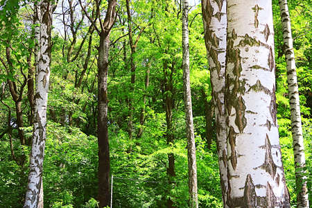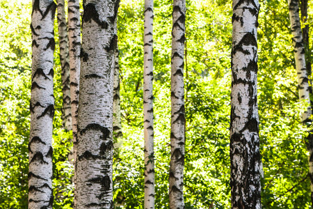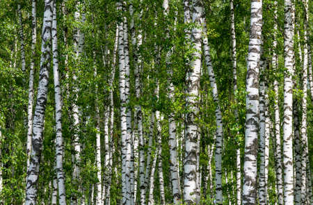 Natural background Russian birch grove, trees. Green eco-friendly summer forest in the morning on a warm sunny day in the park