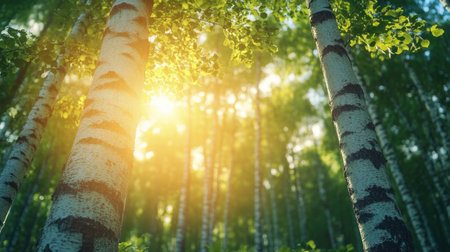 White birch trees growing in a green forest, creating a peaceful and natural scene