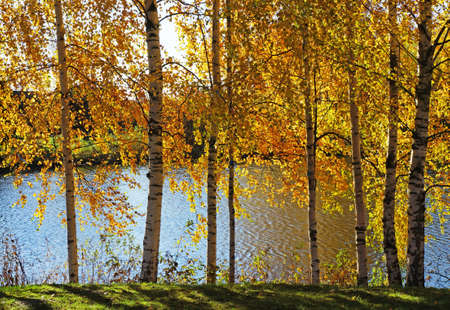 Beautiful nature landscape, golden trees Birch in sunny day in fall season