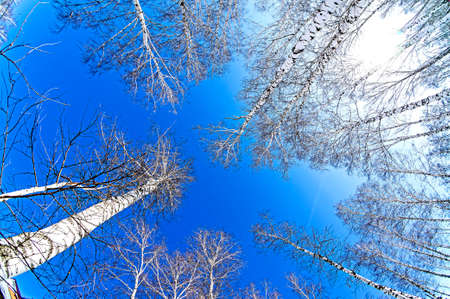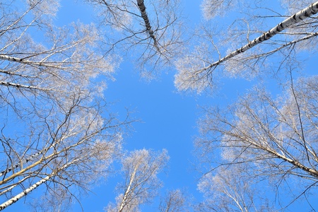photographed close-up bare birch trees in winter, blue sky, tree tops,