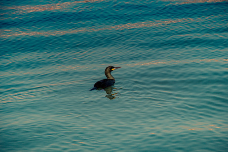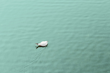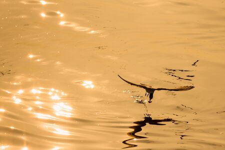 One Seagull birds floating on sea surface under warm evening light at Bang Pu in Samut Prakarn near Bangkok - Thailand