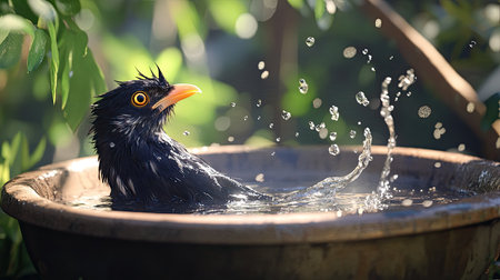 A striking black bird takes a refreshing bath in a garden water bowl, creating mesmerizing splashes. The vibrant environment enhances the scene's beauty, inviting calm and joy.