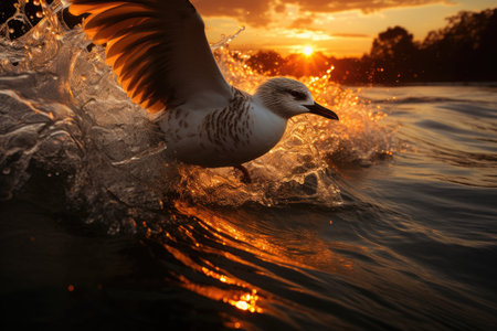 An AI generated illustration of A white seagull gracefully gliding down onto the still body of water