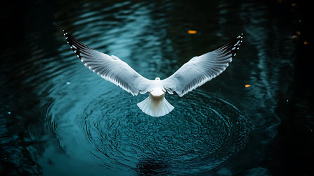 Generative AI Image of White Seagull Flying Free Over a Dark Blue Ocean Lake River Pool
