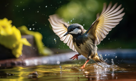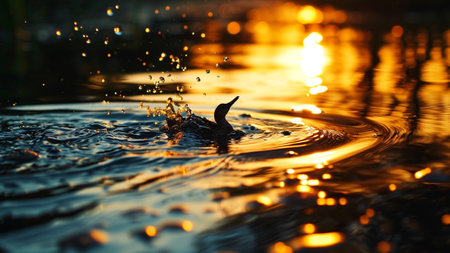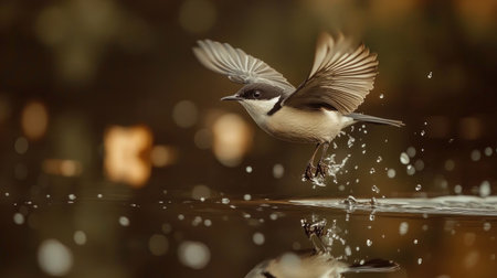 A captivating image of a bird splashing in water, creating ripples and droplets. Soft lighting enhances the tranquil beauty of this wildlife moment.
