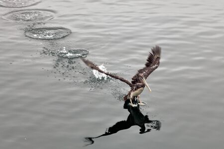 Close-up of a bird flying just above water, with reflection and water droplets visible