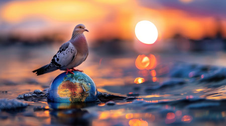 A beautiful bird perches on a globe floating in water during a stunning sunset, symbolizing global peace and the urgent need for environmental awareness.