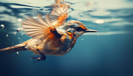 A dramatic shot of a bird in flight with wings spread wide, water splashing around it in vibrant blue tones. The dynamic scene captures the beauty of nature in motion.