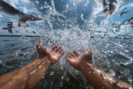 Two hands create splashes in the water as birds fly overhead near a tranquil lake under a bright sky.