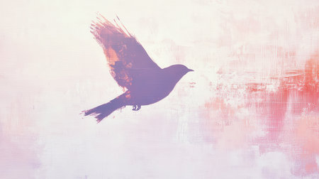 A delicate abstract silhouette of a bird appears in soft pastel hues, gracefully soaring through a tranquil setting characterized by a gentle dusk glow.
