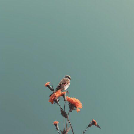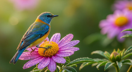Colorful bird perched on vibrant orange flower blossom outdoors