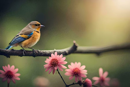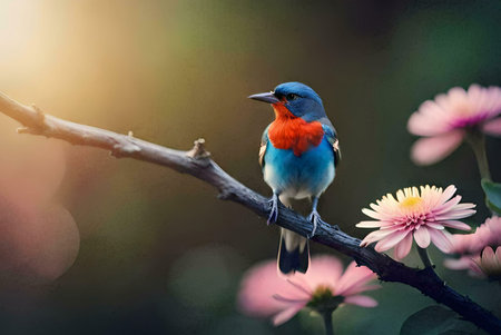 A blue and yellow bird is perched on a branch of a pink flower. Concept of tranquility and beauty, as the bird is surrounded by the delicate pink blossoms. The scene evokes a feeling of peace