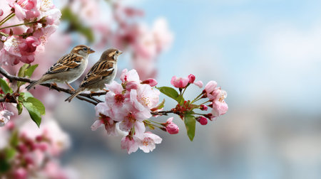 Two sparrows sit gracefully on a branch adorned with blooming cherry blossoms, creating a serene and picturesque spring scene against a soft-focus background.