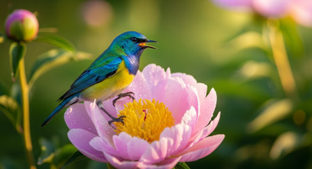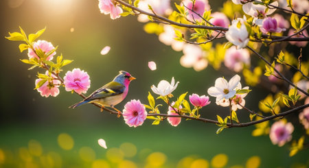 A charming bird perches gracefully on a delicate cherry blossom branch, surrounded by vibrant petals. The soft spring light enhances the beauty of this serene scene.