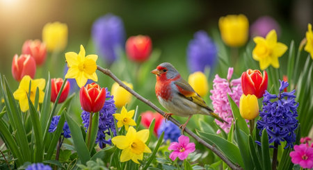 A charming bird perches gracefully on lilac flowers, surrounded by soft bokeh effects, showcasing the vibrant colors of spring and the beauty of nature.