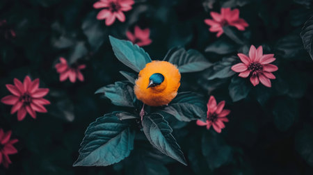 A vivid yellow bird perched on lush green leaves, surrounded by colorful flowers. This image captures the beauty and tranquility of nature, showcasing vibrant wildlife in a serene garden setting.