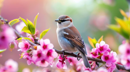 Floral background with little sparrow bird perching on branch of blossom cherry tree with flowers
