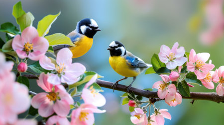 This enchanting image features two vibrant blue tits perched on a flowering branch, surrounded by delicate pink blossoms. Capturing the essence of spring, the scene portrays tranquility and natural beauty in a charming garden setting.