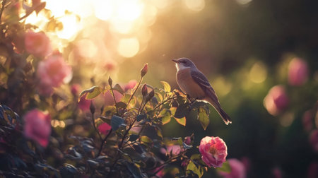 A tranquil scene featuring a bird on a rose bush, illuminated by soft morning sunlight. This image captures the beauty and serenity of nature in a blooming garden.