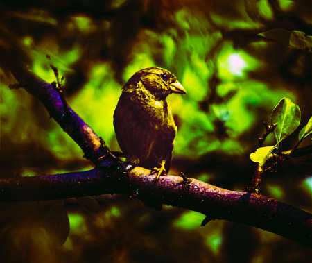 A sparrow sitting on a branch surrounded by leaves in soft morning light, capturing a peaceful and natural moment in a tranquil outdoor setting.