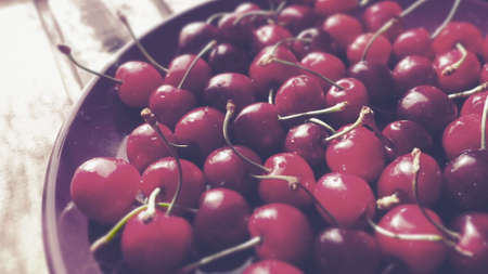 Ripe cherries close-up on a dark background. Selective focus. Good morning concept Rustic authenticity concept, vintage style.