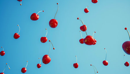Cherries are falling in the blue sky.