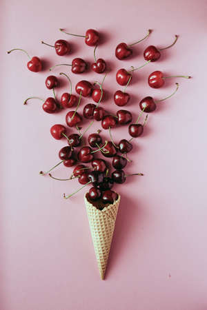 Cherry in waffle cone on pink background, healthy snack, concept flat lay photography and content for food blog