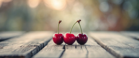 AI Generated. Three Fresh Cherries Displayed on a Wooden Tabletop Outdoors
