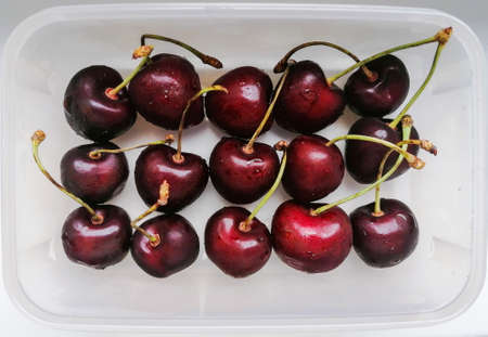 Ripe cherry in a lunchbox on a white background, flatlay
