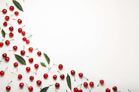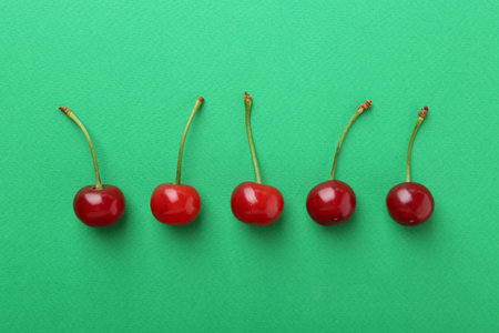 Fresh ripe cherries on green background, flat lay