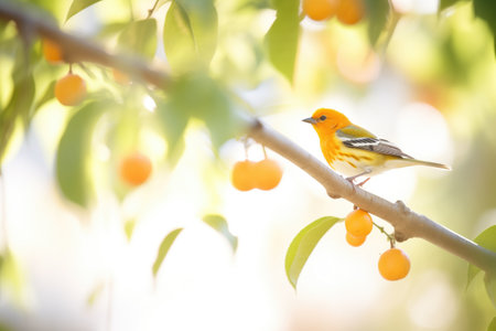 A captivating image of a cherry tree branch adorned with ripe red cherries, surrounded by lush green leaves and illuminated by soft warm sunlight.