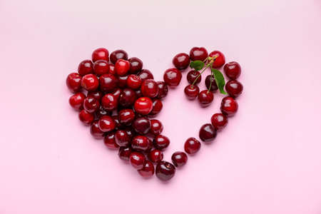 Heart shape made of sweet cherry on color background