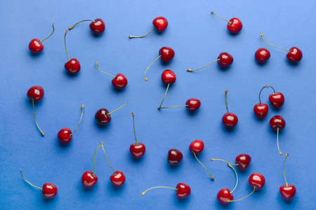Composition of ripe cherries on a blue background. Flat lay, top view.