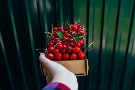 Female hand holding wooden box, crape of sweet cherries, showing and giving it. Deep green dark steel minimal shine background. Summer fruits and berries. Harvest and crop concept. Summertime.