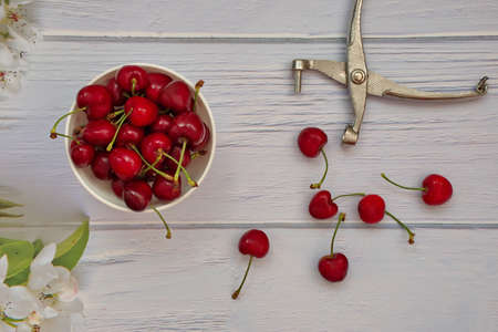 Fresh juicy red cherries in a white plate on the white wooden background. Top view. Copy, empty space for text.