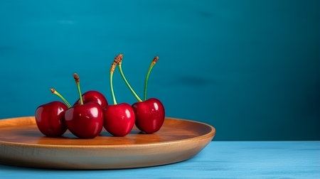 Fresh cherry on plate on wooden blue background. fresh ripe cherries. sweet cherries. Generative AI