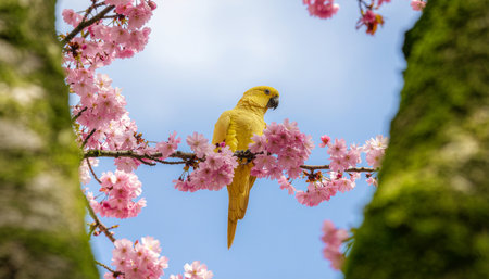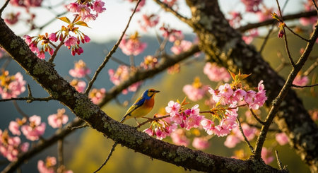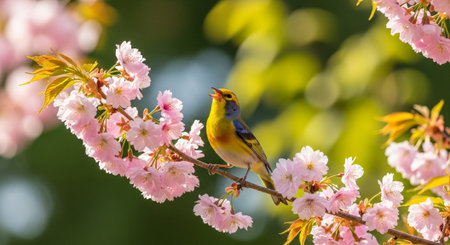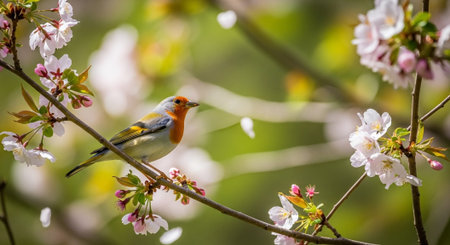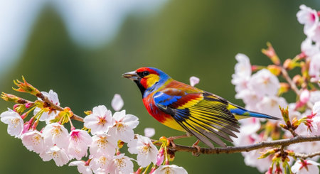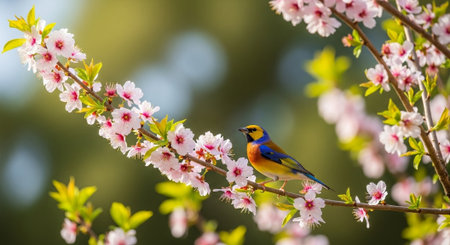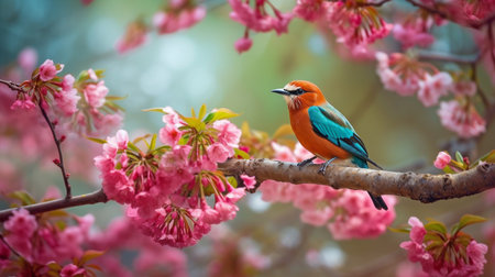 A stunning bird with bright colors sits gracefully on a branch adorned with blooming flowers, perfectly capturing the essence of spring and nature's vibrancy in soft light.