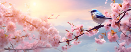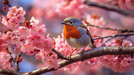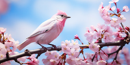 Beautiful pink bird perched on a branch of a cherry blossom tree, with a blue sky in the background. Concept of spring, nature, and beauty.