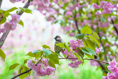 common bird house sparrow, Passer domesticus in the nature perched on flowering Sakura Cherry blossom tree branch. Czech Republic wildlife