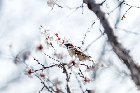 Sparrow on a white apricot tree blossom branch in the city park on spring sunny day. Beautiful nature background. Toned photo, close up, shallow depth of the field.