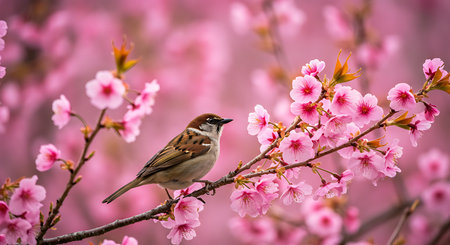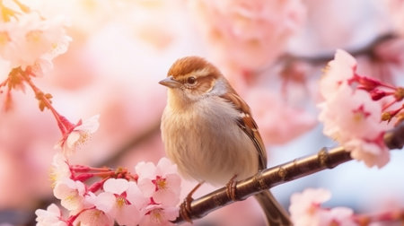 A small sparrow rests on a branch adorned with blooming pink cherry blossoms, evoking a serene spring atmosphere with soft, diffused lighting.
