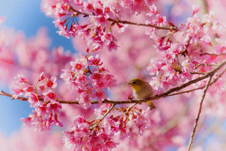 White-eye bird on Cherry Blossom and sakura in Chiang Mai, Thailand